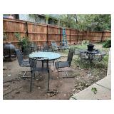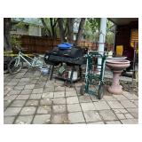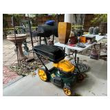 Other Items, and Miscellanea pair of cast iron planters; two metal park benches; three patio dining sets; fire pit; yard tools; Kong XL dog crate; collapsible ladder; birdbaths; Oklahoma Joe's Smoker Grill; Schwinn bike; concert benches and pots; huge fountain; Yard-Man 'Powermore' lawn mower; metal mailbox; ladders; toolbox;