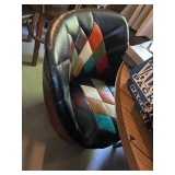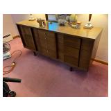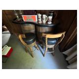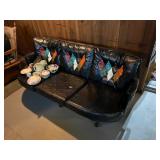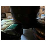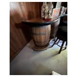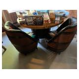 FURNITURE: Unique 5 Pc. Barrel table and chair set, Barrel bar and stool set, Unique leather couch, Mid Century Modern bedroom dresser w/ mirror, Oak dropleaf table, Hutch, Couch, Lamp table, Tables and more.
