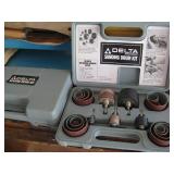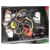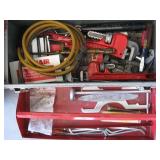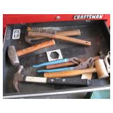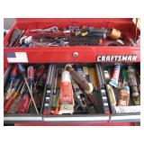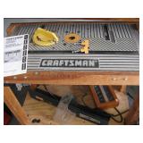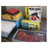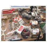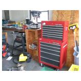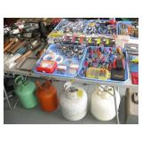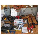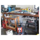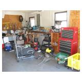 Quite a collection of woodworking and other name brand tools in the garage including wood lathe, bandsaw, drill press, bench grinder, miter chop saw, tablesaw, router in table, sanders, brad nailer, skill saw, sabre saw, drills, heat gun, bar & Jorgensen wood clamps, numerous supplies, accessories, fasteners, various bits, voltmeters, air conditioning freon 11 & R-22 (EPA cert. req'd), vacuum pumps, propane, tall red Craftsman rolling tool chest on cabinet, vise, mechanics hand tools, workbench, saw horses, shop vac, pressure washer, air compressor, two small chest freezers, 6' step ladders, spray paint, waferboard and small lumber, long handled yard tools, fertilizer spreader, automotive battery charger, jack-stands, draw tite ball hitch, boat propeller, anchors, etc...