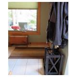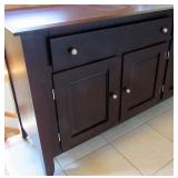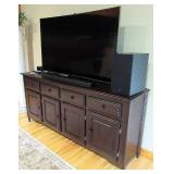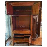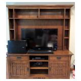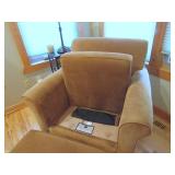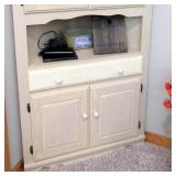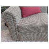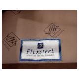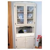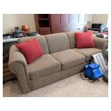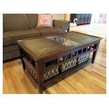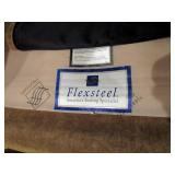 LIVING ROOM FURNITURE: 3 CUSHION SOFA, FLEXSTEEL RECLINERS. COFFEE TABLE, NUMEROUS ACCENT PIECES. WOOD LOW STORAGE CABINETS WITH DOORS, HANDMADE PAINTED WOOD CORNER DISPLAY CABINET.