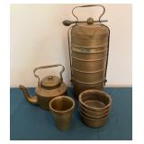 - Antique Brass Tiffin Lunch Box, Tea Kettle, Bowls and Cups