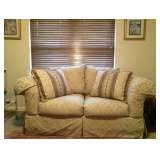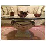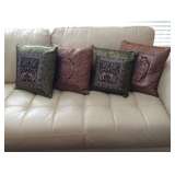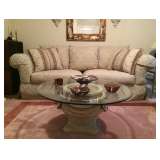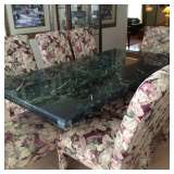 Gorgeous Green Marble Dining Table Four slat back upholstered seat dining chairs Italian travertine dining table-solid slab with two base pieces Six fully upholstered dining chairs Bassett Furniture Console/Sofa Tables Bassett Furniture End Tables Contemporary Coffee Table Black Granite Topped Credenza Contemporary China cabinet Upholstered corner chaise Massoud arm chair and ottoman from Haverty's Metal round top accent table Bombay and Co. round accent table Welton TV Stand Gorgeous Cherry Bassett Office Furniture Tall Back Leather Office Chairs Kitchen Stool Pair of wood folding chairs Stanley Furniture high and low dressers Two Queen Beds with head and footboards TV Armoire Three piece Entertainment Center King Metal Canopy Bed Side Tables Natuzzi White Leather Sofa and Chair Rowe Furniture Sofa and Loveseat Mid-Century Round Side Table