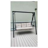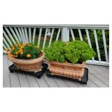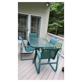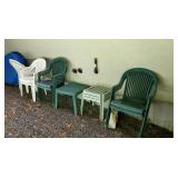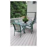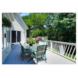Deck and Patio: Patio tables and chairs (two sets) in green. Glider, Potted plants