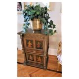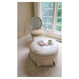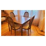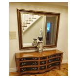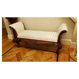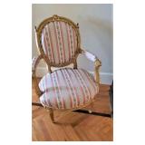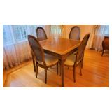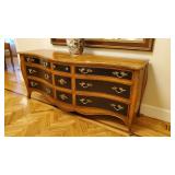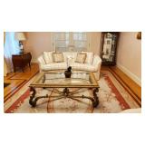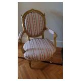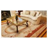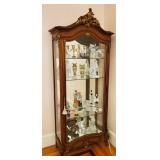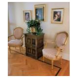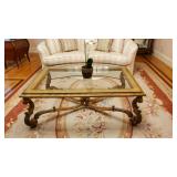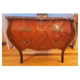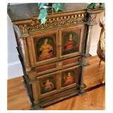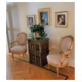 ANTIQUE FURNITURE: Fine pair of Louis XV marquetry marble top commodes, Provincial style curio cabinet with carved gilt detail, Beautiful games table with set of four caned chairs, Large Provincial style dresser, Fine Baroque style upholstered bench, Oversized glass coffee table with carved fruitwood frame, Pair of French Louis XV style giltwood armchairs. Unusual Grand Tour painted cabinet. Very large inlaid china cabinet. Glass front cupboard doors with drawers and doors below. A fine quality piece.