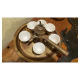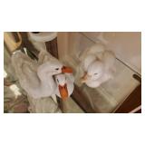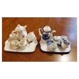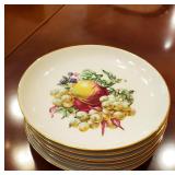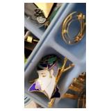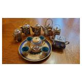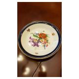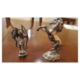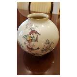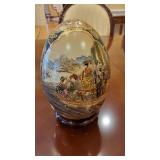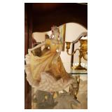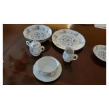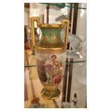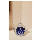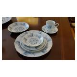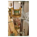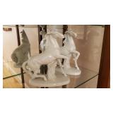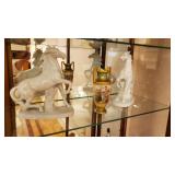 CHINA, GLASS, POTTERY: Austrian hand painted porcelain cabinet vase with scenic figural decoration, Herend figurines, Matched pair of high glazed porcelain horse figurines, two miniature tea sets, collection of miniature Chinese Cloisonne teapots and tea set, Glass paperweights, Large Rosenthal porcelain figurine. Mikasa dinner service- Castle Blue pattern. Service for 12 plus serving pieces. Lenox vase. Hungarian figurines, Studio pottery, Etched crystal stemware plus other sets of stemware and barware.