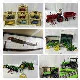 We couldn't get them all in one auction, so we added more! More tractors, reels, vintage tools, pocket knives, clocks. Zebco, Shakespeare, Pflueger reels, John Deere tractors and decor, Foxfire Farm, Farmall, Case, Deutz-Allis, cars, trucks. Even a Longaberger/John Deere basket and a Pocket Fisherman. What more could you want?