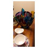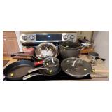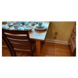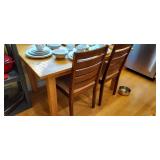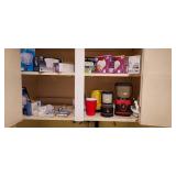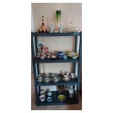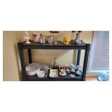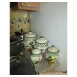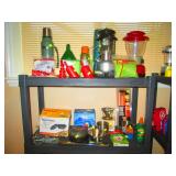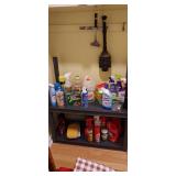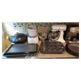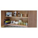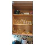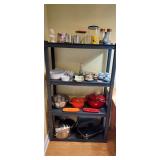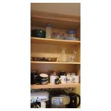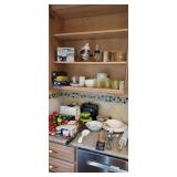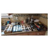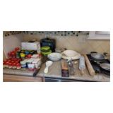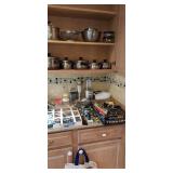Kitchen & entry: Left Large set Noritake Arctic White China, 3 sets of stainless flatware, Electric Belgium Waffle Maker, Small Electric Mixer, Hamilton Beach Electric Egg Cooker, Corningware, Presto Large Electric Frying Pan, Kitchenaid Artisan Mixer with attachments, Kitchenaid Toaster, Cuisinart Yogurt maker, Electric Wok, Calphalon Espresso Maker, Nutribullet, Pots and Pans including Calphalon, Revereware, Greenpan, Lodge 6 quart cast iron dutch oven, Large stainless steel roaster, Vintage Club Saucepan, Much More: Nice assortment of utensils, Baking pans, Sifters, Hand mixer, Set of nesting stainless pans, Glassware, Mugs, Cleaning products, Vintage wood table with 2 chairs Other Stuff