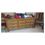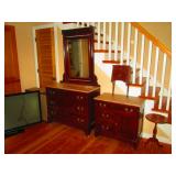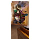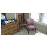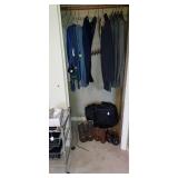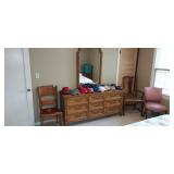 Second Bedroom Straight Right: Bed 2 Side Tables Small Cedar Chest 2 Lamps Clothes Hanger Tie Shirts Men's Sports Coats Dresser w/Mirror 3 Vintage Chairs A Bunch of Caps w/Logos Blankets