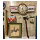 Chopper/forage box, 2009 Chevrolet Silverado (non runner), stoneware, violin, guitar, Miller clock/light, advertising beer chaser glasses, oil cans, Nintendo 64 & Xbox consoles, video games, dvd's, holiday blow molds, Pyrex and misc dishes, kitchenware, aircraft flight instruments, Tarkett laminate flooring (469 square feet), antique sleigh/cutter, Star Wars toys, Legos, Playboy magazines, Snap-On mugs and glasses, 3 piece Cutco carving set, electric pressure washer, Jonsered chainsaw, tile saw, antique and modern furniture, yard tools, Frederic Remington print, fishing poles and tackle, baseball cards, football rookie cards, jewelry and much more.