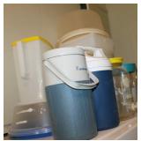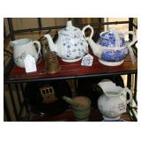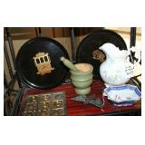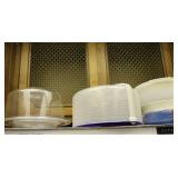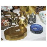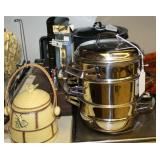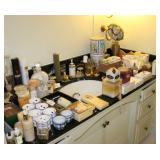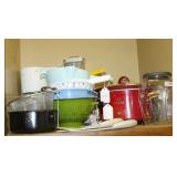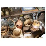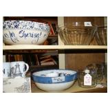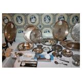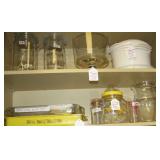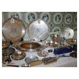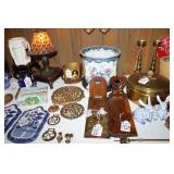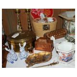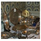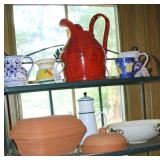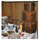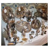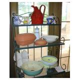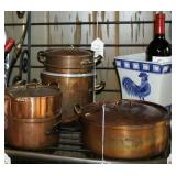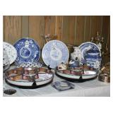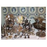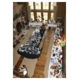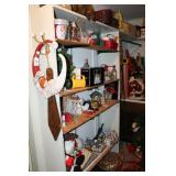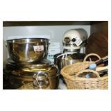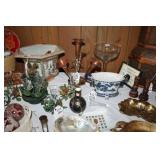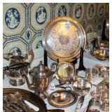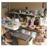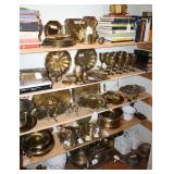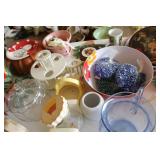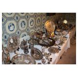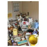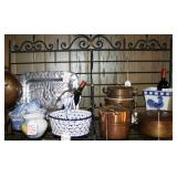 KITCHEN: Spode Christmas dishes & glasses, gadgets, enormous collection of vintage Pyrex & Corning Ware, Kitchen Aid Mixer, appliances, several complete sets of dishes, copper, tons of unusual brass & silver plated serving pieces, pottery (some signed), bar glasses, teapots, granite ware, Tupperware, trivets, etc.