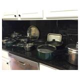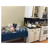Full kitchen with large number of quality pots & pans, small appliances, sets of flatware, sets of dishes, Whirlpool side by side refrigerator/freezer, some vintage kitchen items