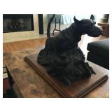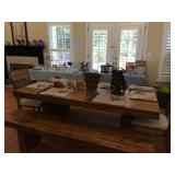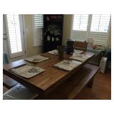 Unique dining room set with large acacia wood table, two long benches & chairs at each end, buffet