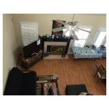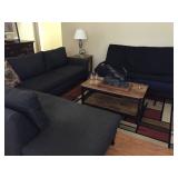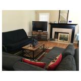 Living room sectional couch, coffee table, TV stand, end tables, floor lamps, table lamps, futon