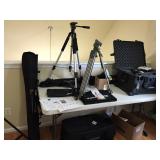 Cameras including Canon EOS Rebel, Sigma 24-135 mm, Canon EF 50 mm, Canon EFS 18-55 mm, Sony HDR-CX150 high definition Handycam Camcorder; Sony HVR-HD1000N digital high definition HDV camcorder, Canon EFS 18-135 mm, Sigma 24-70 mm, Dynatran Professional Series Background Suppport System Model AS-015-2 (2 units), Zeikos camera stand, Video Pro M2 by Sunpak video stand, Fotodiox Canon EOS Macro Extension Set Kit, camera bags, camera filters, camera batteries