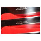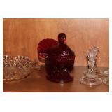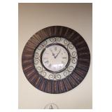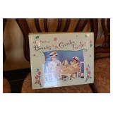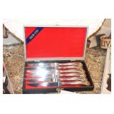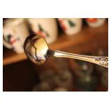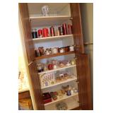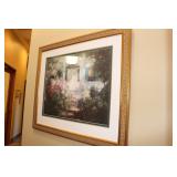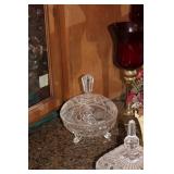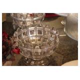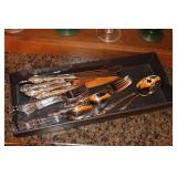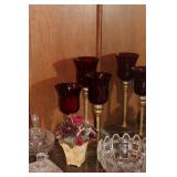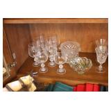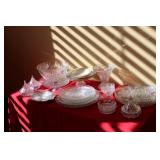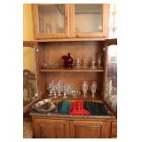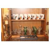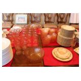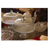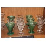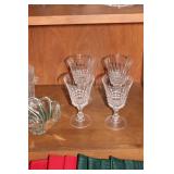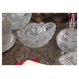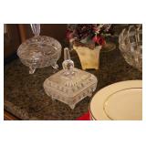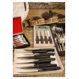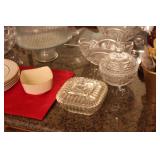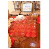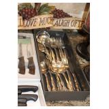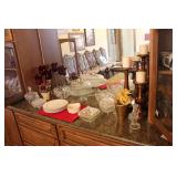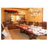 The dining room among other items presents 18 custom made wood chairs along a table to seat 18 - all in excellent condition and available for purchase individually. There are also quite a few sets of Lead Crystal glasses here for sale, as well as Vaseline glass, Cranberry Indiana glass chicken dish, sorbet vintage glasses, plus a Gourmet Collection by Oneida - 3 full dish sets for 8 in white... The dining room is also where you may find some vintage and antique crystal candy dishes, like new Oneida stainless steel flatware set, interesting decor, art and clocks.
