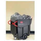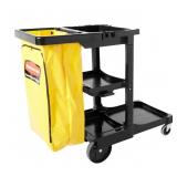 The Rubbermaid FG617388BLA portable utility cart offers a handy solution to cleaning up spills and performing daily chores, and its bottom platform has a solid base that holds mop and wringer buckets. Equipped with three shelves, the cart has plenty of room to hold cleaning supplies or store items for restocking. To keep janitorial supplies in one convenient location, this cart has a hanging zippered bag, hooks for holding signs, and snap-in tool holders that grip items such as mops and brooms. The front platform accommodates WaveBrake® mop bucket or 32-gal. BRUTE® container. Rubber tool grips hold as many as 11 stick-type tools. 2 removable, 10-qt. disinfecting caddies. Aluminum and structural web plastic construction won't rust and can be wiped clean. Hooks hold 2 safety signs. (2) 4-in. casters and (2) 8-in. wheels for enhanced maneuverability. Black. Leakproof, zippered bag for trash removal. 34-gal. recycling/waste bag. Overall dimensions: 46 in. L x 21.75 in. W x 38.38 in. H. Model No. FG617388BLA L32-82 (69)