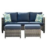 Bring over the entire settle-in to enjoy some time in the sun with these elegant outdoor armchairs. Complete with beige polyester cushions and a gray wicker-like frame, this outdoor set is both UV and water-resistant for convenience during any kind of weather. Trending aesthetics and a classic design define this outdoor patio furniture collection making it a beautiful addition to any outdoor space including the backyard, patio, porch, balcony, or poolside. Assembly required. Outdoor sofa set: this big size comfortable outdoor sectional sofa is suitable for 3-friends and lets you enjoy leisure time with friends and family, suitable for most places Wicker and cushion: handwoven wicker makes the whole set much more sturdy and the high-density cushion gives you strong lumbar support for better comfort Sturdy and practical: spacious armrest and deep seat makes the set cozy but modern and no need to worry about the wicker falling off when they are used after a long-time. High-quality fabric: the fabric provides exceptional UV protection, the fabrics are environmentally-friendly and they could dry very fast after sprinkling water or raining These sets of furniture are easy to assembly, you could save about 50-minute to assemble them than usual so you can enjoy and experience them with just a few simple steps. The ergonomic backrest and armrests are slightly inclined to maximum comfort. The high density and soft back cushion give you strong lumbar support for better comfort and relaxation. Three-seat Sofa Size:76.77" Lx30.11" Wx28.74" H. Three-Seat Seat cushion: 23.42" Lx23.62" Wx4.00"H. Three-Seat back cushion: 24.01" Lx18.11" Wx4.00" H. Ottoman Size: 22.04" Lx23.62" Wx11.41" H. Ottoman cushion:22.04" Lx23.42" Wx4.00" H. Cushion Thickness (in.) 3.54; Seat Height (in.) 17.32; Table Height (in.) 0; Table Length (in.) 0; Table Width (in.) 0; Assembly Required Yes; Care Instructions Clean with a mild soap solution, scrub with a sponge, rinse with cold water and dry completely.; Chair Style Armchair; Commercial/Residential Residential; Cushion and Pillow Features Fade-resistant, Fast Drying, Removeable slipcover, UV Resistant, UV protected; Cushion Color or Pattern Blue; Cushion Style Box Edge; Fabric Color Family Blue; Fabric Type Olefin; Fill Material Foam; Frame Finish Gray; Frame Material Aluminum; Frame Primary Finish Gray; Included Hardware Included; Number of Pieces 3-Piece; Patio Furniture Features Cushioned, Eco-Friendly, Ergonomic, Fade Resistant, Removable Cover, Removable Cushions, UV Protected; Pattern Solid; Seating Capacity Seats 3 People; Set Includes Cushions Included, Ottoman Included, Sofa Included; Set Seating Type Sofa Seating Groups; Style Modern, Rustic; Model No. 1006324142 L30-76 (57)