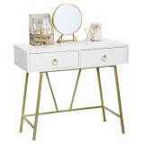 Item Is New And Refundable Only Before The Item Leaves The Building AND If Different Than Described. MSRP: $170 VERSATILE USES】 This desk can be used as a study desk, writing table, office desk, especially as a vanity dressing table or makeup table, elegant and beautiful, perfect to decorate your office or home. 【LARGE CAPACITY】With 2 large drawers, this writing desk will definitely provide enough storage space for you to put documents, necessities or all your skin care products, cosmetics, jewellery and other beauty supplies. 【ELEGANT DESIGN】Enginerred wood in a white finish combines elegantly with gold thickened metal frame, creates sturdy structure and an elegant appearance. Exquisite pullers make the drawer can be easily opened. 【DIMENSIONS】Item weight is 20.8kg. Overall dimensions is 35.4" L x 15.7” W x 31.3” H, Max capacity weight is up to 70 lbs. The desk is not only elegant but also functional and practical.