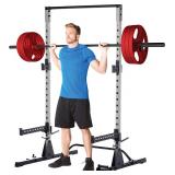 Item Is New And Refundable Only Before The Item Leaves The Building AND If Different Than Described. MSRP: $249 HEAVY DUTY FRAME】- with an 800 LBS. Barbell Weight Capacity lets you workout with peace of mind. 2"x2" Square Steel Frame with 1 inch holes allow you to add on standard sized attachments. Frame Compatible with barbells that have a 46 inch (collar to collar) grip width. 【INCLUDED LANDMINE ATTACHMENT】- Adds so much variety to your workouts that you'll never be bored. Compatible with Standard or Olympic barbells and can be placed on different parts of the frame. DON'T PAY EXTRA for something that is essential. 【ADJUSTABLE HEIGHT PULLUP BAR】-Absolutely necessary if you have a lower ceiling or just prefer a shorter jump up. 【EXTRA BENCH PRESS SPACE】-More space than other cages due to our rear support bar being elevated from the ground. That allows maximum space for your bench to slide back. You'll be glad with every rep that you chose a rack with more space. 【EXTRA LONG 19.5 INCH SAFETY ARMS】- Give yourself more room when doing squats. Up to 2X Longer than other cages. When your legs are burning and you gotta rack that weight, you'll be glad you chose this one.