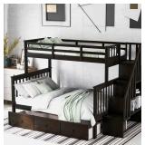 Item Sold As Is. Please Preview! MSRP: $2165 INCOMPLETE BOXES 2 AND 3 OF 3 ONLY. If you need extra sleeping space or your family love sleepovers, this Stairway Twin-Over-Full Bunk Bed with Drawer is perfect for your home. Four open shelves located beneath the attached staircase provide ample storage for your family' toys and bedding. High-quality, solid pine legs and a strong, durable frame ensures stability and durability for long-term use, and can be separated into one twin,one full-size bed. Slat kit included so box springs are not required. This bunk bed is designed with a clean silhouette and a hue of elegance. It suits all styles of home decoration, and completes the look of any bedroom. · [Maximized storage space] Four compartments of different sizes hide underneath the stairs of this bunk bed and are perfect for you to store quilts, bed sheets and other necessities. On top of that, you can store books and toys, making room-tidying a breeze. Functional and aesthetic, this bunk bed will enhance any bedroom. · [Versatility galore] This bunk bed features one twin size upper bunk, one full size bottom bunk for accommodating your family or any overnight sleepers. It can also be divided into two individual beds for even more convenience, depending on how you want to organize your space. Slat distance: 7.6". No spring box needed.