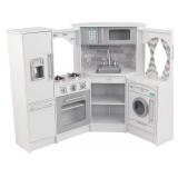 Item Is New And Refundable Only Before The Item Leaves The Building AND If Different Than Described. MSRP: $230 Innovative corner design fits perfectly across two walls Burners have realistic lights and sound Shelving and hanging pegs for pots, pans and accessories Oven, microwave, refrigerator, freezer and washer doors all open and close Cordless phone with hands-free clip; removable sink for easy cleanup Crafted of premium, recyclable materials for long-lasting play