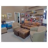 Living room furniture including Bassett leather couch, leather ottomans, end tables, side chairs, large storage ottomans