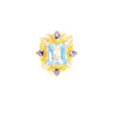 18K Yellow Gold Custom Cocktail Ring with Blue Topaz Centerstone, Diamonds, and Sapphires
