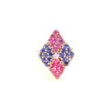 14K Yellow Gold Cocktail Ring with Rubies, Sapphires, and Diamond