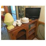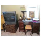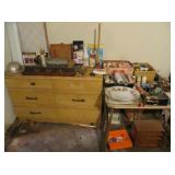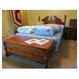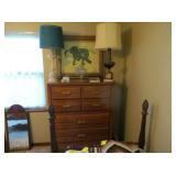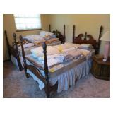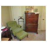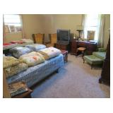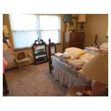 Large Items: Great sale with lots of 1930s Duncan Phyfe style mahogany furniture, drop leaf dining table with six empire chairs, matching china cabinet, pair twin full four poster beds with matching vanity, chest-on-chest, night stands, and bachelors chest. Pair of matching curio cabinets, dining table with four chairs, lots of refinishable furniture, fun vintage chair and ottoman, cedar chest, queen size bed, washer and dryer, daybed with trundle, recliners, Eastlake Victorian side table, pair of wingback chairs, American Empire center table, small occasional tables, antique bench, computer desk with matching file drawer, Art Deco bedroom furniture, green leather sofa, 1920s smoke stand, four ladder-back chairs, bakers rack