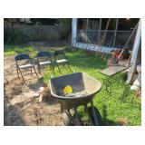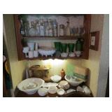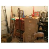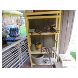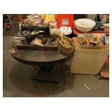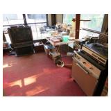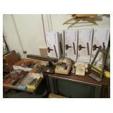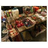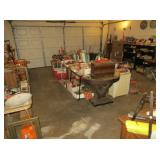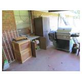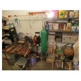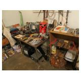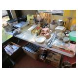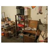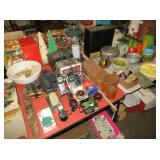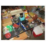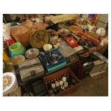 Misc: Books, brassware, vintage antique bike, wheel barrow, two stainless steel grills, lots of Pyrex Corning Ware and Corelle, vintage kitchenwares, Mid-Century vintage oven and matching cooktop, fishing rods and equipment, antique tools, hand and power tools vintage Christmas, antique sewing matching, metal detectors, chainsaws, metal bookshelves