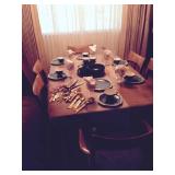 DIRECTIONS: Custer Avenue, Edward Drive, 1238 Michael Drive LOOK FOR RED & WHITE SIGNS! ITEMS INCLUDED IN SALE: Heywood Wakefield Mid Century Dining Room Table w/Six Chairs, Pair Mid Century Step End Tables & Set Of (3) Snack Tables, Set (4) Thonet Mid Century Modern Chairs, American Martinsville Mid Century Bedroom Set, Mid Century Modern Teak Coffee Table, French Gold Painted Curio, Large Service Mint Condition LuRay Pastels Pink Dinnerware Including Serving Pieces, Stemware, Set Dirilyte Flatware w/Advertising Post Card, Set 1847 Rogers Silver Plate Flatware & Assorted Loose Pieces, Cast Iron Witches Kettle, Costume Jewelry, Many Pieces Framed Art Work, Collectible Pens & Pencils, Many Vintage Cameras, Antique & Decorative Swords & Daggers, Many Musical Instruments (Violin, Guitar, Ukulele, Flute - Some As Is), Metal Tonka Jeep, Jackie Jensen Little League Baseball Bat, Holiday, Commercial Clothing Rack, Antique Combination Safe, Golf Cart (Needs Battery) |