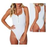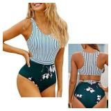 **Size LARGE** MOLYBELL Women's One Piece Stripes & Floral Print High Waisted Monokini Swimsuit with Cutout Zip Up Racerback - White Green