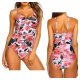 Material: 80% Nylon, 20% Spandex; soft, smooth, stretchy, comfortable and durable quick-drying fabric. Size LARGE fits US 12-14. Pull on, tie and zipper closure. The high waisted monokini swimsuit combines a green stripedwhite tank top of zipper racerback with a floral print high waisted bottom. Tie waist at back is adjustable to fit snugly your shape. Features removable padded push-up bra. Hand wash only.