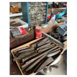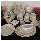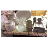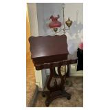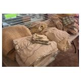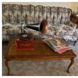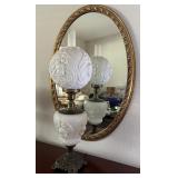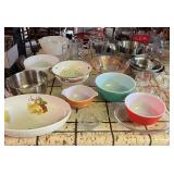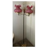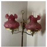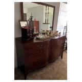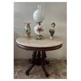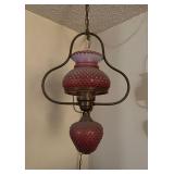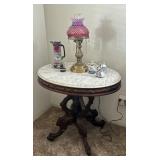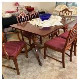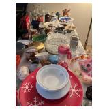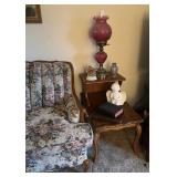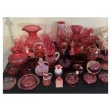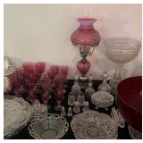 PARTIAL LIST: Mahogany dining table, 6 chairs and buffet, two antique marble top tables, LOTS of cranberry glassware - several Fenton floor lamps and table lamps, pitcher & glasses, stemware, vases & MORE! French Provincial sofa, chair & ottoman, coffee table and end tables, antique oak pedestal dining table with 4 leaves, chairs, antique mahogany flip top table, oak curio/china cabinet, barstools, large mirrors, 2 Lane recliners, Mahogany dresser with mirror, highboy, night stands and 4 poster bed, small tables, lots of doilies & tablecloths, crocheted bedspreads, kitchen items - pots & pans, Pyrex, dishes & glassware, silver plate flatware, books, DVDs, VHS, LPs & 78s, Joan Walsh Anglund figurines, lots of men's clothing and shoes, women's clothing, shoes, purses & jewelry, bedding & towels, file cabinet, garage refrigerator, storage cabinet, lots of tools, garage shelving, patio table, and LOTS of miscellaneous!