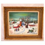 - Vintage Framed A. Kowalski Folk Art Painting Snowy Winter Town Scene (R-11)
