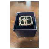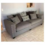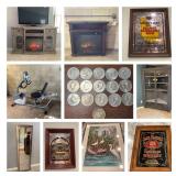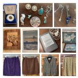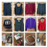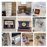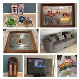 Combo sale for several clients. Items include St. John Knit ladies wear, jewelry, Swarovski jewelry, Cindy Crawford Home sofa, Samsung 43" TV, mirrored bar signs, 1943 Rockola jukebox, Pontiac Motor Division 14" rims (set of 5) and more.