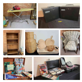 Second sale at this mid century ranch home, with more vintage treasures up for bid. Several bookcases, cabinets and other furniture, decorative collectibles, suitcases, linens, men's and women's accessories, costume jewelry, and other household items.