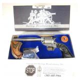 Serial #H79084 (Circa 1975). The double/single-action Cobra is the baby in Colt’s wheelgun snake lineup. This Colt Cobra is a Second Edition. Features a 2" snub nose barrel, nickel plated finish, six round swing-out cylinder, notch and ramp sights and checkered walnut grips. Locks up tight. Some freckling on the cylinder but otherwise appears to be in great condition. 4