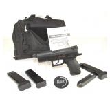Serial #: 23-010731 The HK Mark 23 Caliber .45 ACP pistol gives shooters match grade accuracy equal to that of the finest custom made handguns, yet exceeds the most stringent operational requirements ever demanded of a combat handgun. The Mark 23 provides this accuracy without the need for hand-fitted parts common in custom-built match pistols costing thousands of dollars more. One of the most thoroughly tested handguns in history. Features: Threaded O-ring barrel with polygonal bore profile; Match grade trigger; One piece machined steel slide; Frame mounted decocking lever and separate ambidextrous safety lever; Can be carried “cocked and locked” in single action mode with the safety lever on; Patented HK recoil reduction system; Corrosion resistant blued finish; Corrosion proof fiber-reinforced polymer frame; Oversized trigger guard for use with gloves Universal mounting grooves for installing accessories; Ambidextrous magazine release lever; Extended slide release; Extractor doubles as a loaded chamber indicator; Patented Lock-Out Safety device 20-B