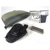 Serial #: DA5850 The AMT BACKUP is a stainless steel, double action only pistol designed to meet all the requirements of a backup gun. It has a heavy double action trigger and basic groove style sights to prevent snagging when drown from deep concealed carry. This pistol appears to be in great condition, and includes a soft case, holster and two magazines. 286