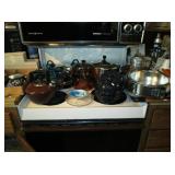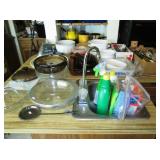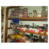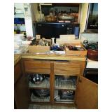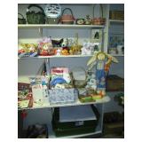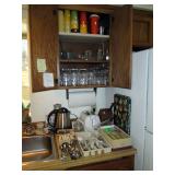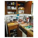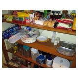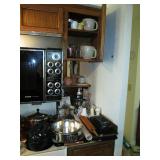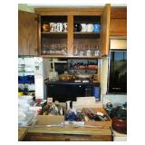 Kitchen: packed with pots, pans, baking dishes, fondue pot, Corning corn flower and many other patterns, set of Smartware flexible baking pans, lots of utensils, Tupperware, microwave, Hamilton Beach stand mixer, Kitchenaid hand mixer, food processor, juicer, coffee maker, Iced tea maker, Bread maker, blender, toaster, mugs, pyrex glass baking pans, cookie sheets, muffin and loaf pans, too much to mention.