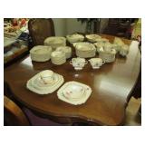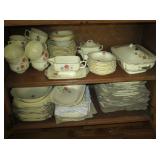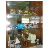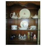 China/Glass/Silver: Nice set of US Franciscan Desert Rose, Rare Set of Franciscan Encanto Rose including very hard to find Coffee Pot and Teapot, Service for 12 Arcoroc France luncheon set, green depression glass, Fostoria frosted pink Epergne, stoneware pitchers and pots, Set of Lightheart Botanic gardens including serving pieces, Royal Worcester fruit and vegetable motif dishes, Homer Laughlin service for 12 Century style C2 dinnerware including creamer, sugar, covered casserole, vegetable bowl, rectangle serving bowl, gravy boat with under plate, Trudeau 18 piece tableware set new in box, Waterford Millenium Wineglass set in box, stemware, open salts, Rockwell and other collector plates, etched and press cut vases, candle holders, etc., Villeroy & Boch Candlestick, Venetian wine set, Silverplate platters and teas et. much more.