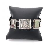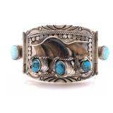 - 2018 NATIVE AMERICAN STERLING SILVER BEAR CLAW, TURQUOISE, CORAL, AND OPAL HINGED BRACELET