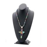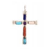 - 2576 GEORGE & LUPE LEEKITY ZUNI 9 STRAND STERLING SILVER TURQUOISE SANDCAST CROSS PENDANT NECKLACE