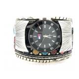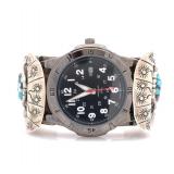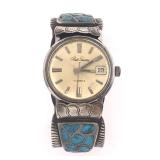 - 2636 VINTAGE SOUTHWESTERN STERLING SILVER TURQUOISE INLAY WATCH CUFF WITH PAUL SAISON WATCH