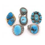 - 2623 LOT OF 5 NATIVE AMERICAN STERLING SILVER TURQUOISE RINGS