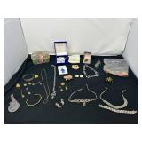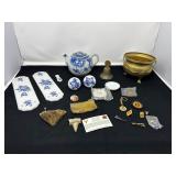 - Lot #13 - Vintage Delft Blue Hardware w/ Teapot, Antique Coin Purses, Prehistoric Shark Tooth Fossil, Metal Bell & More