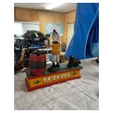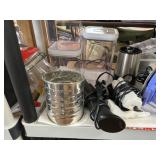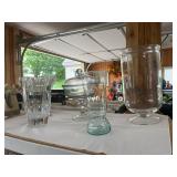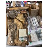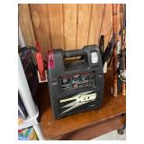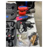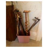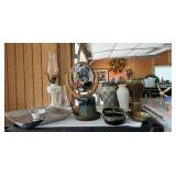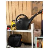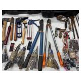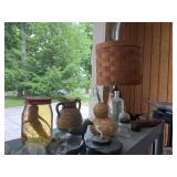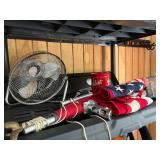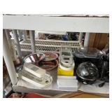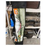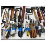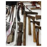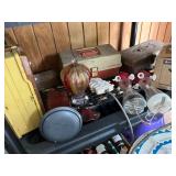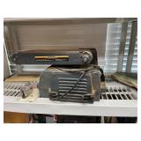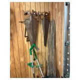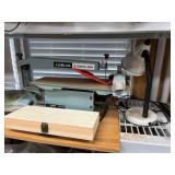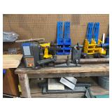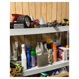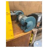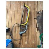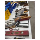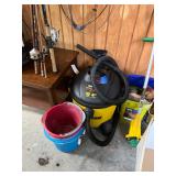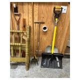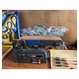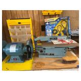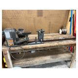 Workshop: lawn tools, wood working tools, 8" bench grinder, Craftsman 12 in wood lathe, Delta 15" scroll saw, portable air tank, Craftsman belt disc sander, shop vac, Craftsman All in One cutting tool in case,