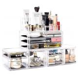 - LARGE MAKEUP ORGANIZER BOX: This large makeup organizer box with a big top tier for bottled cosmetics and 3 divided drawers is ideal for brush, jewelry, lipstick, eyeliner, eyebrow pencils, eye shadows, nail polishes, nail clippers, stores your cosmetic items of different shapes and sizes while keeping all your beauty products in one place.This dustproof makeup case is multifunctional and space-saving.