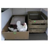 Hanging Bird Feeder, Ceramic Chicken Ornaments, Wooden Crate